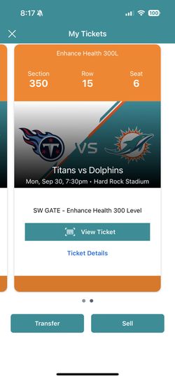 MNF Dolphins Vs Titans 2 Tickets $325Miramar, FL