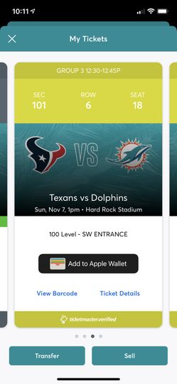 TEXANS @ Dolphins Tickets (NOV 7th)$440Pembroke Pines, FL
