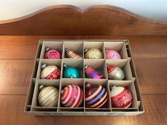 Box (no lid) of 12 Vintage Christmas Ornaments Shiny Brite Poland Mica Bells 2”-3” wide $250New Milford, CT