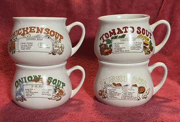 Vintage Set of 4 Soup Recipe Ceramic Mug Bowls Chicken Tomato Onion Mushroom NEW without Box!$20Spring Hill, FL