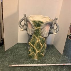 Double Elephant Flower vase, Ceramic with palm tree color design, trunks up on both elephants. 11.5” tall no cracks or issues. This is a rare piece, $45Joliet, IL
