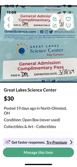 Great Lakes Science Center$30North Olmsted, OH