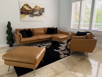 Albany Park- Lido Collection- Chaise Sectional, Armchair, Ottoman, Tan Vegan Leather With Brass Metal$4,500Fort Lauderdale, FL