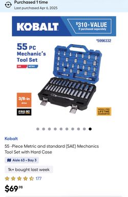 Kobalt 55 piece metric and standard (SAE) mechanics tool set with hard case$50Murrieta, CA