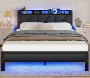 Furnulem Queen Size Bed Frame with Headboard and LED Lights, Upholstered Bedframe with Charging Station and USB Port, Platform Metal Bed Frames, No Bo$110Houston, TX