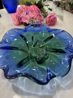 Royal Gallery Poland Art Glass Blown Blue Green Flower Bloom Bowl in Miami.$39Medley, FL