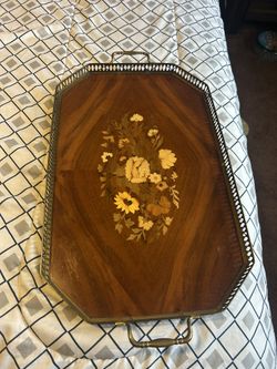 Vintage Retro MCM Tray Italian Marquetry Inlaid Wood Floral Brass Handles $100Irwindale, CA