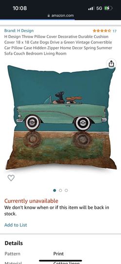 H Design Throw Pillow Cover Decorative Durable Cushion Cover 18 x 18 Cute Dogs Drive a Green Vintage Convertible Car Pillow Case Hidden Zipper Home De$14San Diego, CA