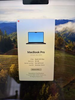 2023/2024 MacBook Pro 14 Inch M3 max processor 36 GB memory one terabyte storage AppleCare March 22, 2027$1,899Burbank, CA