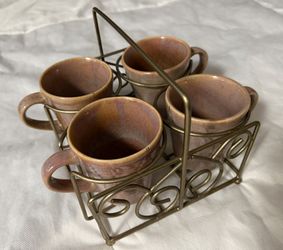 Set Of 4 Pink Stoneware Mugs With Metal Caddy $25Castle Shann, PA