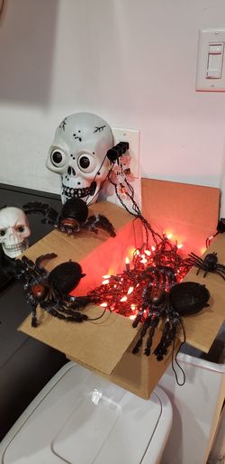 Halloween Decorations With 3 Orange String Lights, 2 skeletons, 3 Big Spiders With hanging bands And 1 Small Spider. $15Long Beach, CA
