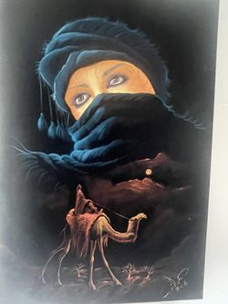 ROMANTIC MIDDLE EASTERN BLACK VELVET PAINTING MEASUREMENTS 26” X 18” OF A BEAUTIFUL BEDOUIN WOMEN AND MAN SITTING ON A CAMEL DREAMING OF L$100San Diego, CA