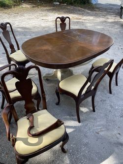 Oval wooden dining table with six matching chairs. Dining table legs need to be screw on table 1 chair arm needs to be screw or glue selling for $7$75Mount Dora, FL