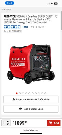 Predator 5000W Super Quiet Dual Fuel Inverter Generator (NEW) – Save on Tax$1,100San Jose, CA