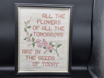 Vintage Framed Cross Stitch Piece All The Flowers Of All The Tomorrows.., 13x16$20Joliet, IL