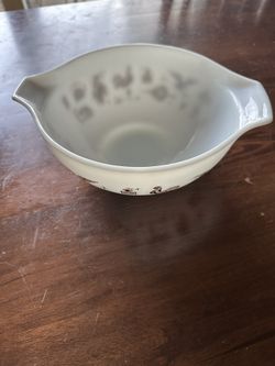 White Pyrex mixing bowl with brown farm-themed design.$25West Chicago, IL