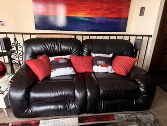 Comfortable black leather electric reclining sofa with decorative pillows$150Ventura, CA