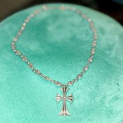 Chrome Hearts Sterling Silver Gothic Cross With round floral chain And a Regular safety Pin Closure (engraved Chrome Hearts Safety Pin Is Missing.$899Diamond Bar, CA