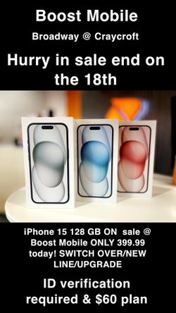 Boost Mobile 5612 e. Broadway Blvd 85711 Iphone 15 Only 399.99$399Tucson, AZ