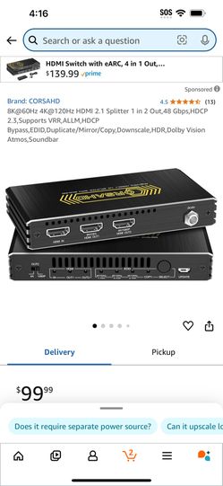 Splitter: 8K@60Hz 4K@120Hz HDMI 2.1 Splitter 1 in 2 Out,48 Gbps,HDCP 2.3,Supports VRR,ALLM,HDCP$65Corona, CA