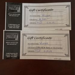 Mazda dealer/mechanic gift certificates$225Edmonds, WA