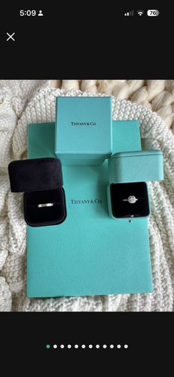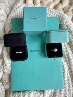 Tiffany & Co engagement and wedding band platinum rings with diamonds. Engagement "Soleste" double halo ring cushion cut .27ct. Sizes 5.5$6,000Hollywood, FL