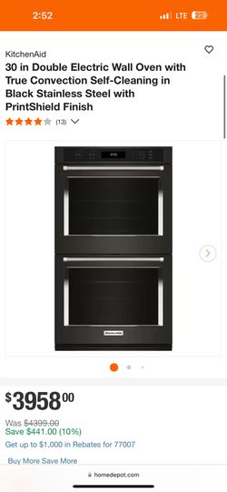 30 in Double Electric Wall Oven with True Convection Self-Cleaning in Black Stainless Steel with PrintShield Finish$2,200Cypress, TX