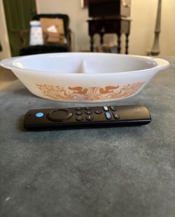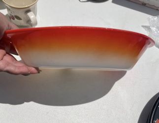 Glasbake J2352 oval divided serving dish with the orange "Cornucopia Bird" pattern. J$10Whittier, CA