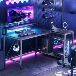 Bestier 42" Reversible LED L-Shaped Gaming Desk with Power Outlets & Monitor Stand &Storage Shelves & Hooks for Bedroom&Home Office, Black 3D