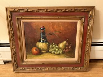 Signed Original Oil Painting Still Life Wine Bottle Fruit Grapes Antique Carved Gold Frame Dumont$125Paramus, NJ