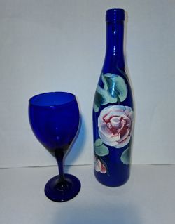 hand painted roses on blue glass wiine bottle flower vase w/ one blue wine glass $10 FIRM$10Boca Raton, FL