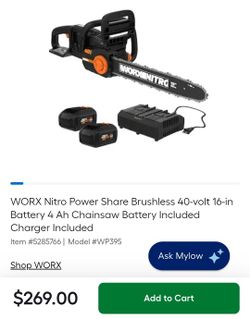 WORX Nitro Power Share Brushless 40-volt 16-in Battery Chainsaw With 2 4.0AH Batteries$135Fresno, CA