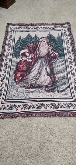 Vintage Old St Nick Woven Tapestry Throw Blanket Christmas, Fringe 1990s Made in USA, Manual Woodworkers and Weavers MWW 44 x 64$40Sacramento, CA