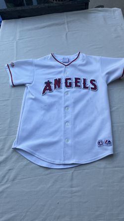 Majestic kids' baseball jersey with bold Angels logo across the chest. Button-front design with red trim on collar and sleeves.See measurements for pr$10Arrowhed Farm, CA