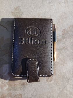 Vintage Hilton Hotel's branded faux-leather notepad holder with gold tone mini mechanical pencil and a Vitronic paper refill.$15Euless, TX