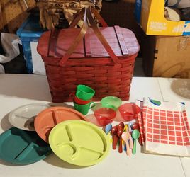 Estate Sale VTG MCM Red Wicker Woven Rattan Picnic Basket with Gitsware Plates, Table Cloth USA$10Elmhurst, IL