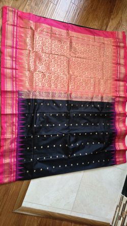 Beautiful Jet Black Pure Gadwal Silk Saree with Peach Pink Contrast Gold Zari Border & Blouse Piece$220Las Vegas, NV