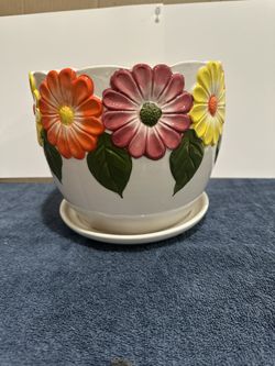 Hand Painted Ceramic Planter With a Saucer Design Flowers In Orange Pink Yellow & Green Leaves$20Whittier, CA