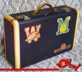 CooL 1930 UW Wisconsin Bucky Badger & Marquette University College Decal SuitCase • Vintage Original OLD • Nice Shape! • SUPER RARE Badger Logo!$150Big Bend, WI