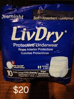 LivDry 3XL Overnight Adult Diapers for Women and Men, Max Protection Incontinence Underwear (XXX-Large, 10-Pack)$20North Little Rock, AR