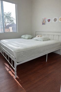 New Condition California King Mattress + White Metal Bed Frame – $850$880Burbank, CA
