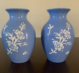 Two Lovely Vintage Blue Stangl Pottery 7” Tall Vases With White Floral Design -Appliqué #4007$15Venice, FL