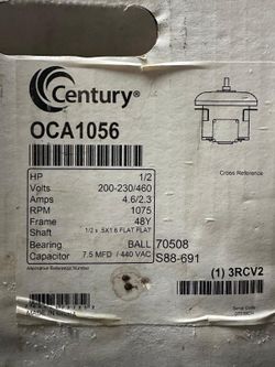 A/C Century® OCA1056 HP 1/2 Volts 200-230/460 Amps 4.6/2.3 RPM 1075 Frame 48Y Shaft 1/2 x .5X1.6 FLAT FLAT Bearing, BALL 70508 Capacitor 7.5 MF$100Miami, FL