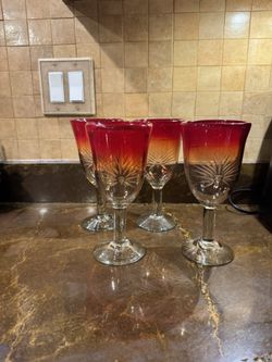 Lot 4 Hand Blown Red & Clear Tall 8 3/8" Lrg Wine Glass Goblet Etched Starburst$35Homer Glen, IL