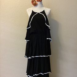 Black Cotton/Rayon Dress With White Trim Open Sleeves Size Medium Elastic Waist Womenswear $30Moreno Valley, CA
