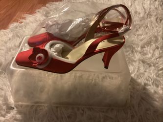 Elegant Satan Red Rose Shoes Size 7.5. Ladies New With Box$40Moreno Valley, CA