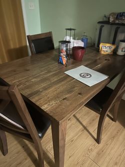 A wooden table with six wooden and brown leather chairs$400Indianapolis, IN