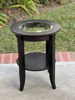 Cheap! Round Dark Wood End Table w/ Glass Top and Lower Shelf$15Lake Forest, CA