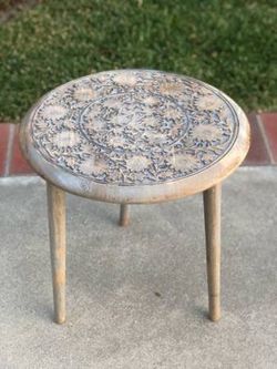 Round Carved Wood Engraved Accent Table in Antique Gray Wash 18” Round$25Lake Forest, CA