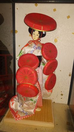 Vintage Nishi & Co 15” Japanese Geisha Silk Kimono Doll Dancing Hats In Wooden Glass Case $100 $100San Diego, CA